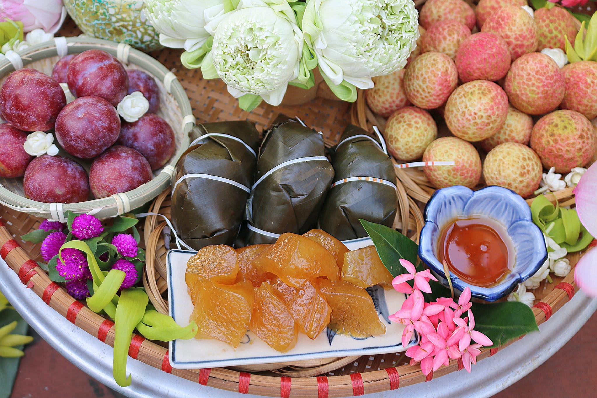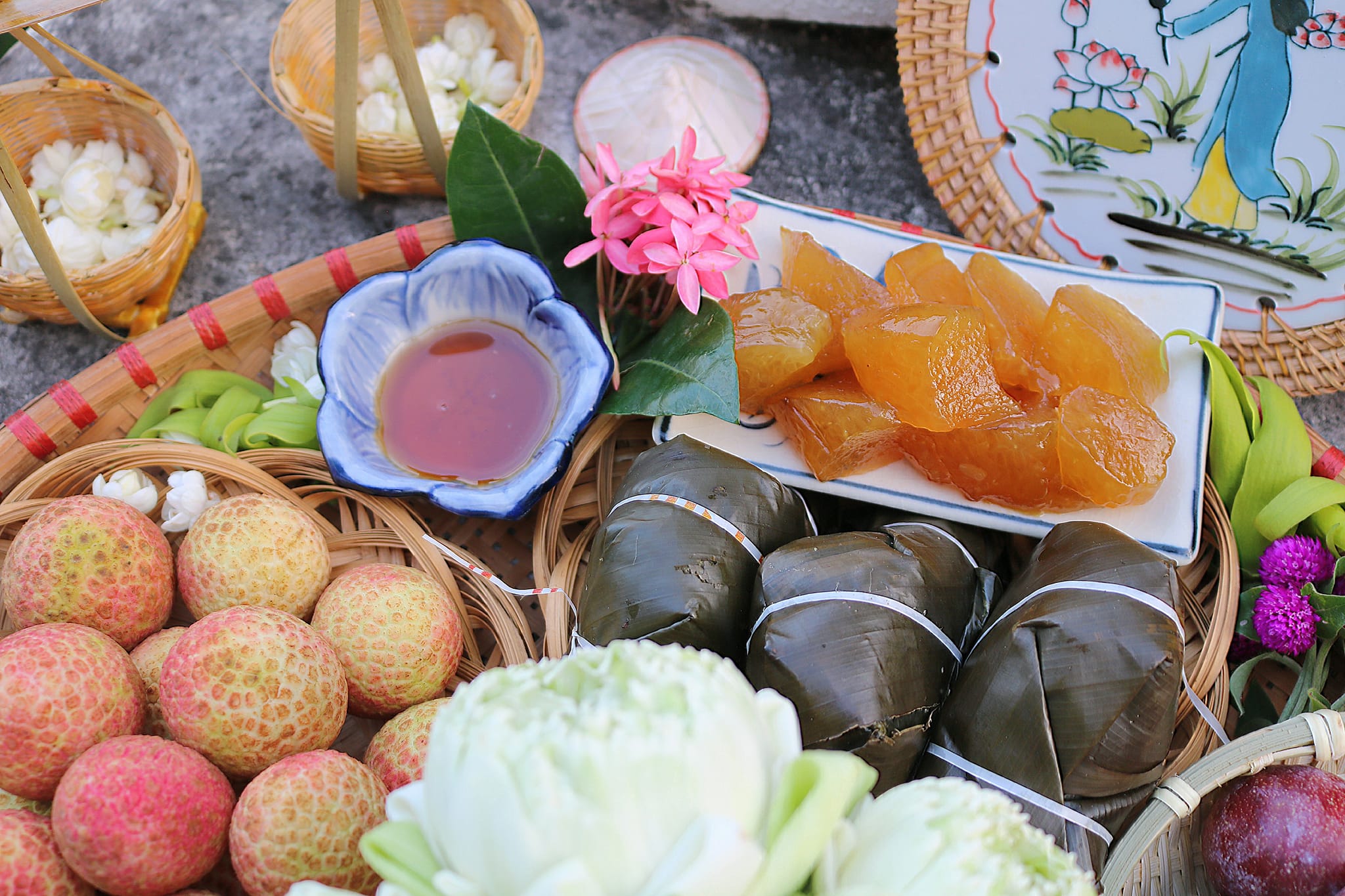 Nếu như Tết Hàn thực mọi người làm bánh trôi bánh chay, Tết Nguyên đán làm bánh chưng bánh dày thì Tết Đoan ngọ trong mâm lễ của mọi nhà không thể thiếu được những đĩa hoa quả đặc trưng của mùa như vải, mận,… và cơm rượu nếp/rượu cẩm.